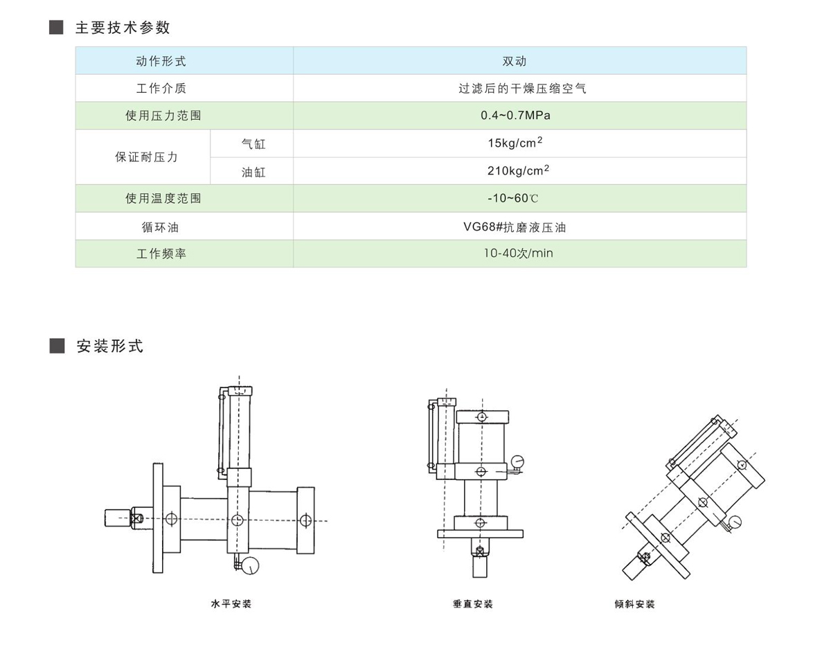 產品說(shuō)明(míng):能將低壓空氣轉換(huàn)成高(gāo)壓油,輸出增壓比可達25:1左右,主要用於衝壓(yā)、鉚接、彎曲、切斷、壓印、拉伸和壓力裝配等衝壓作業處。